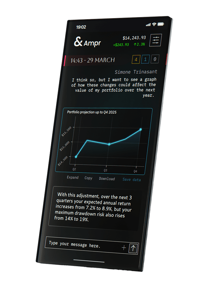 Ampr is focused on you and built to learn and understand your financial goals, constraints, and preferences. A personal financial concierge translating your financial goals into 24/7 monitoring and execution.