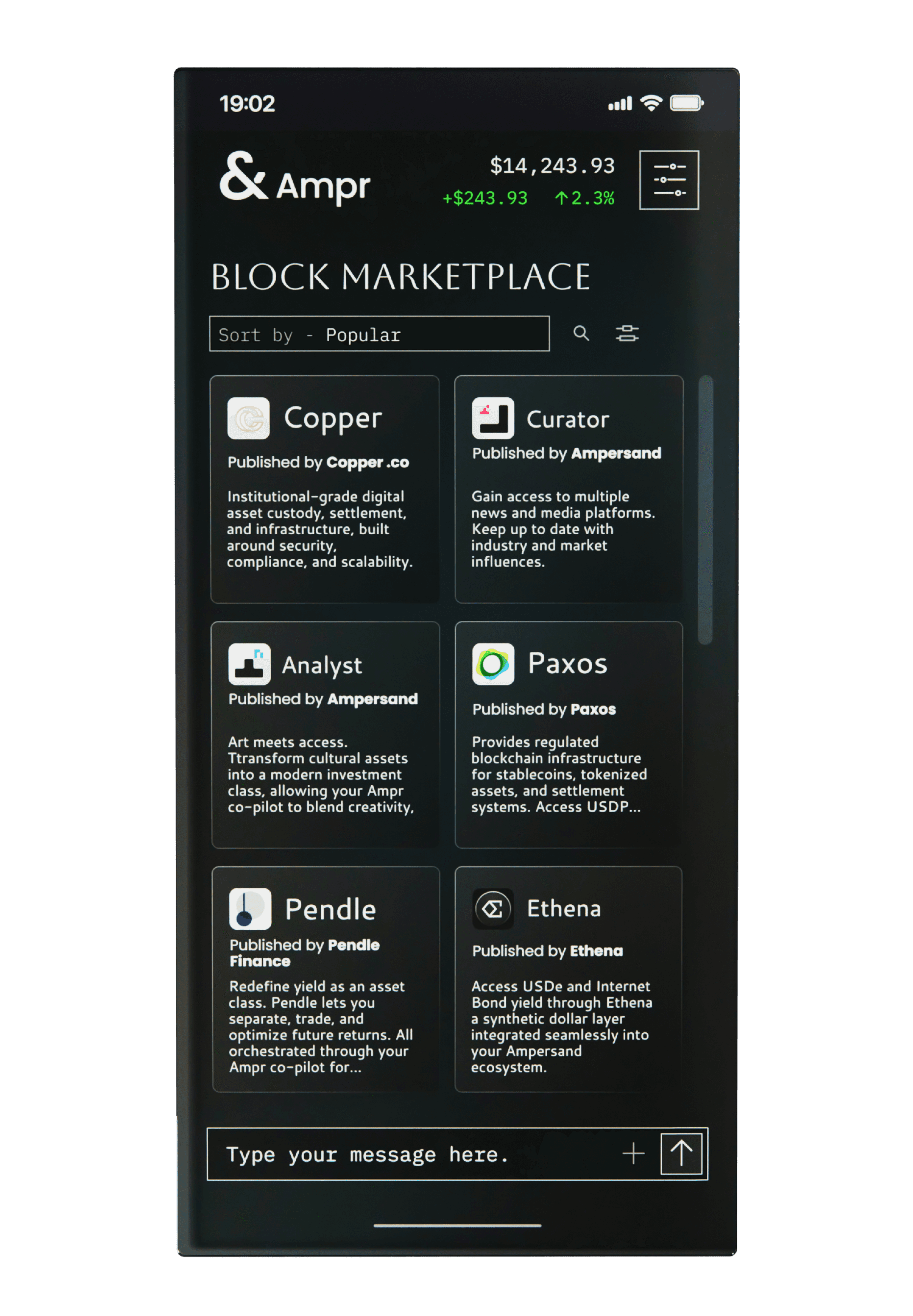 Ampersand is about technology and leaves the actual financial products and analysis to the leading firms and protocols. Ampersand is an open architecture, designed to invite the best opportunities into one convenient interface.